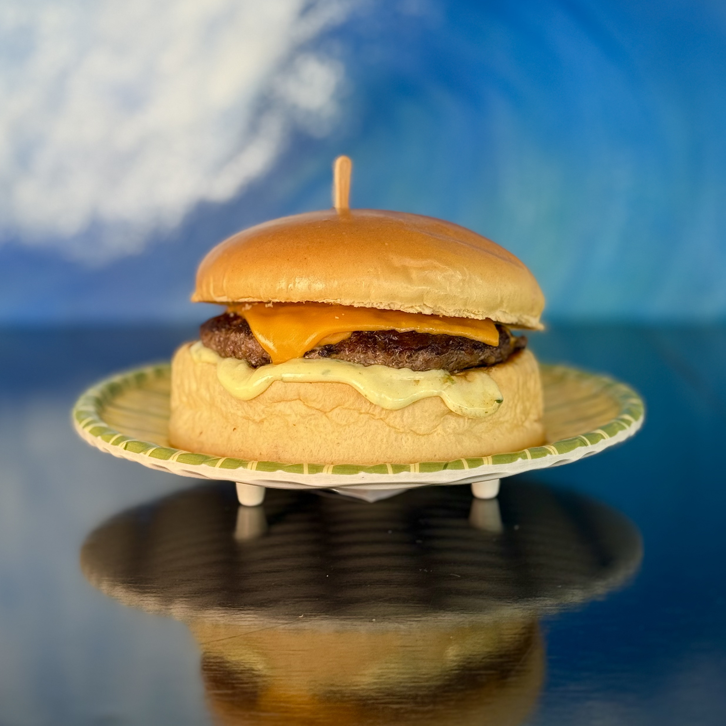 Pão, hamburguer de costela150g, maionese maresia e queijo cheddar.
