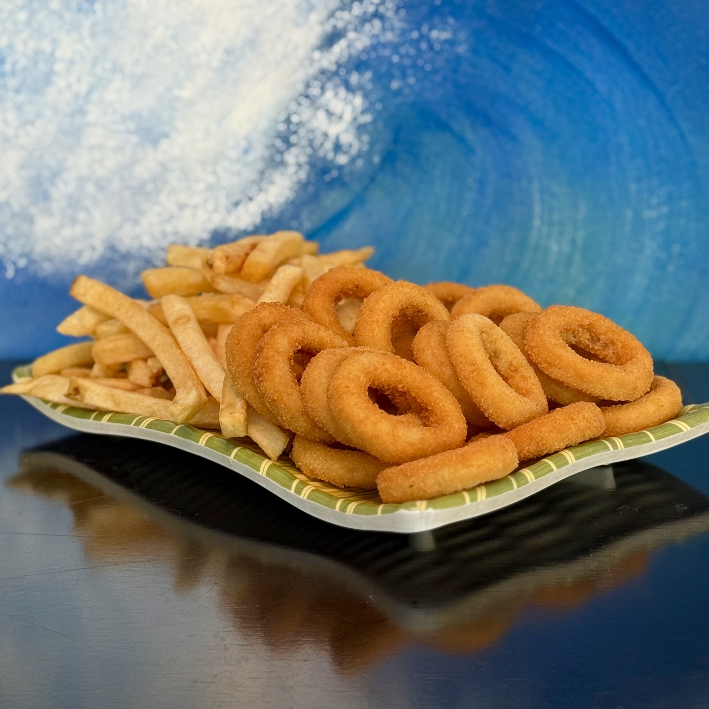 Nossa deliciosa porção mista + 12 anéis de cebola e fritas +- 300g.