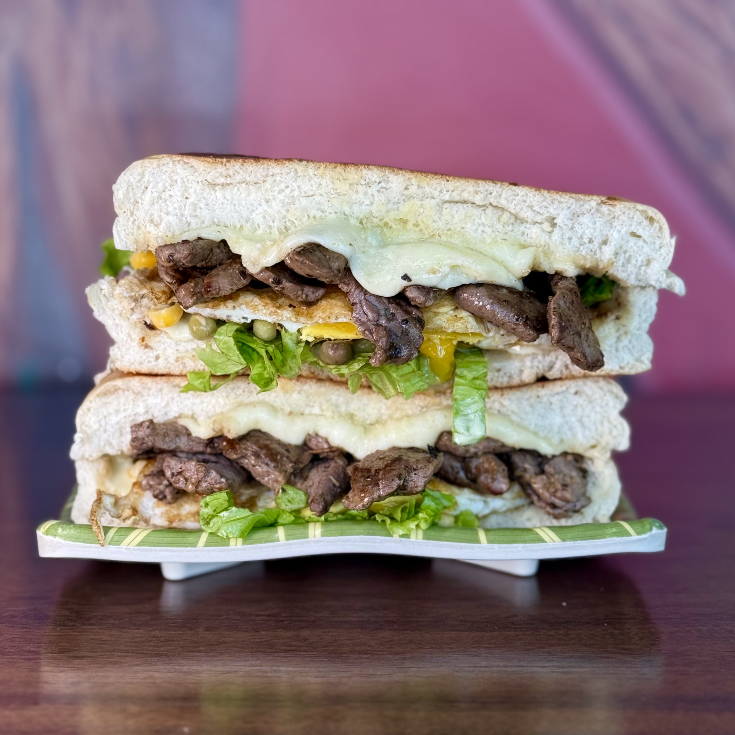 Pão, iscas de carne 130g, queijo mussarela, ovo, alface, tomate, ervilha, milho, catchup, mostarda e maionese da casa.