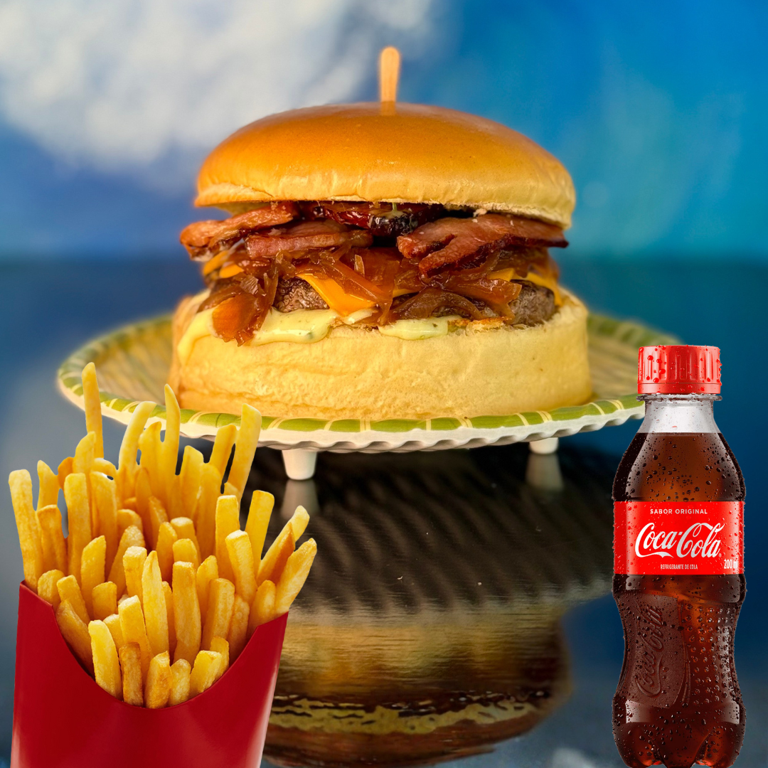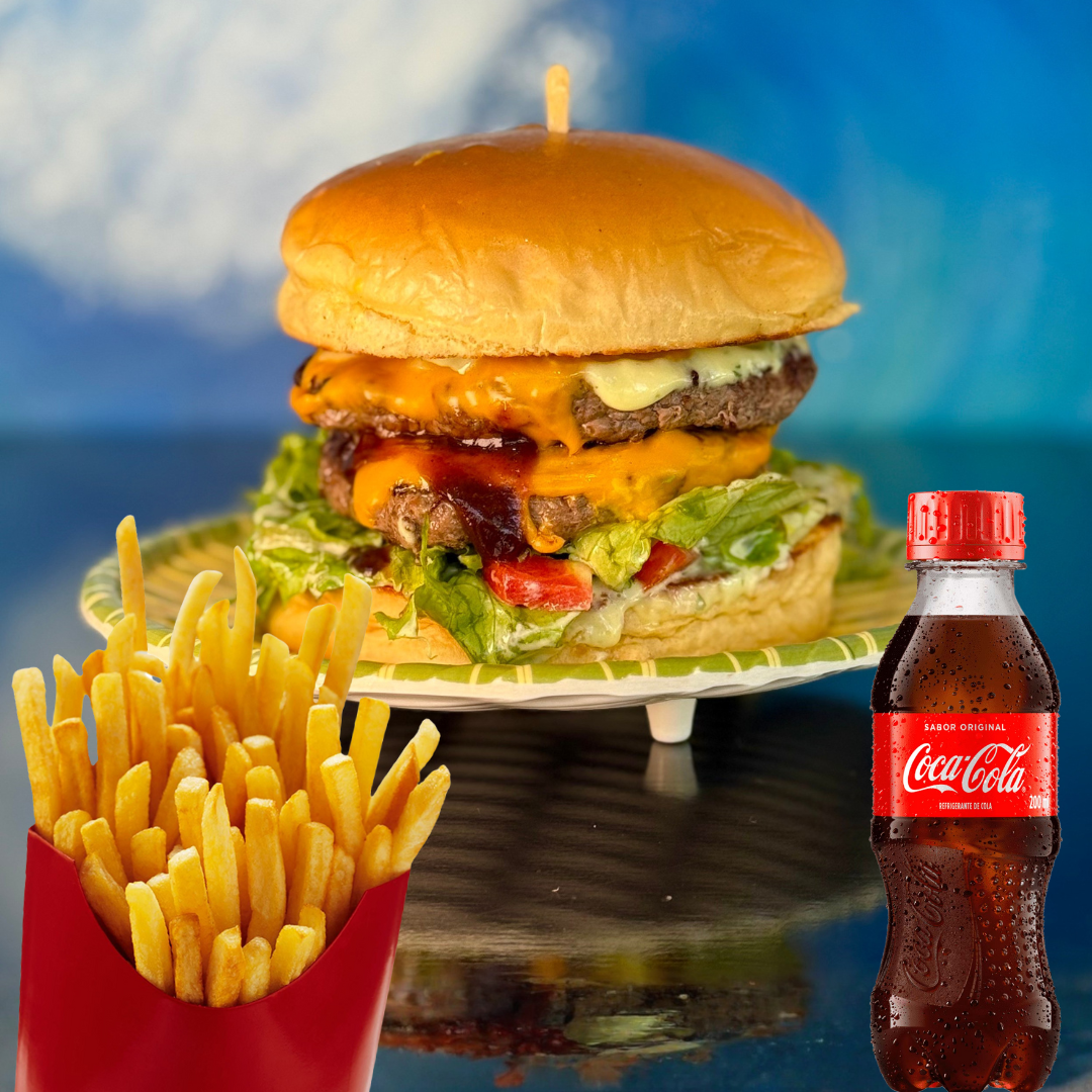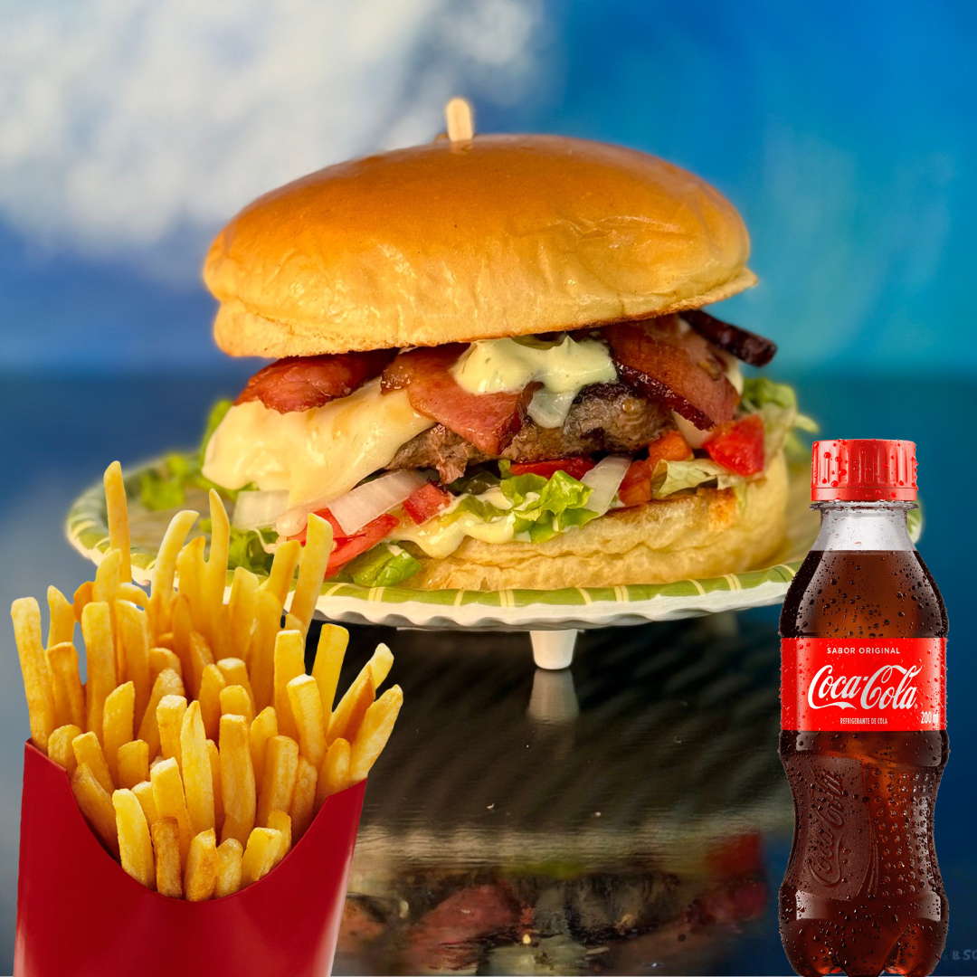 Hamburguer Maré Alta (Pão, 2 hamburguer de costela 150gr cada, molho barbecue, duplo queijo cheddar, alface, tomate, mostarda e maionese da casa.), bebida 200ml, fritas pequena ou 8 áneis de cebola.