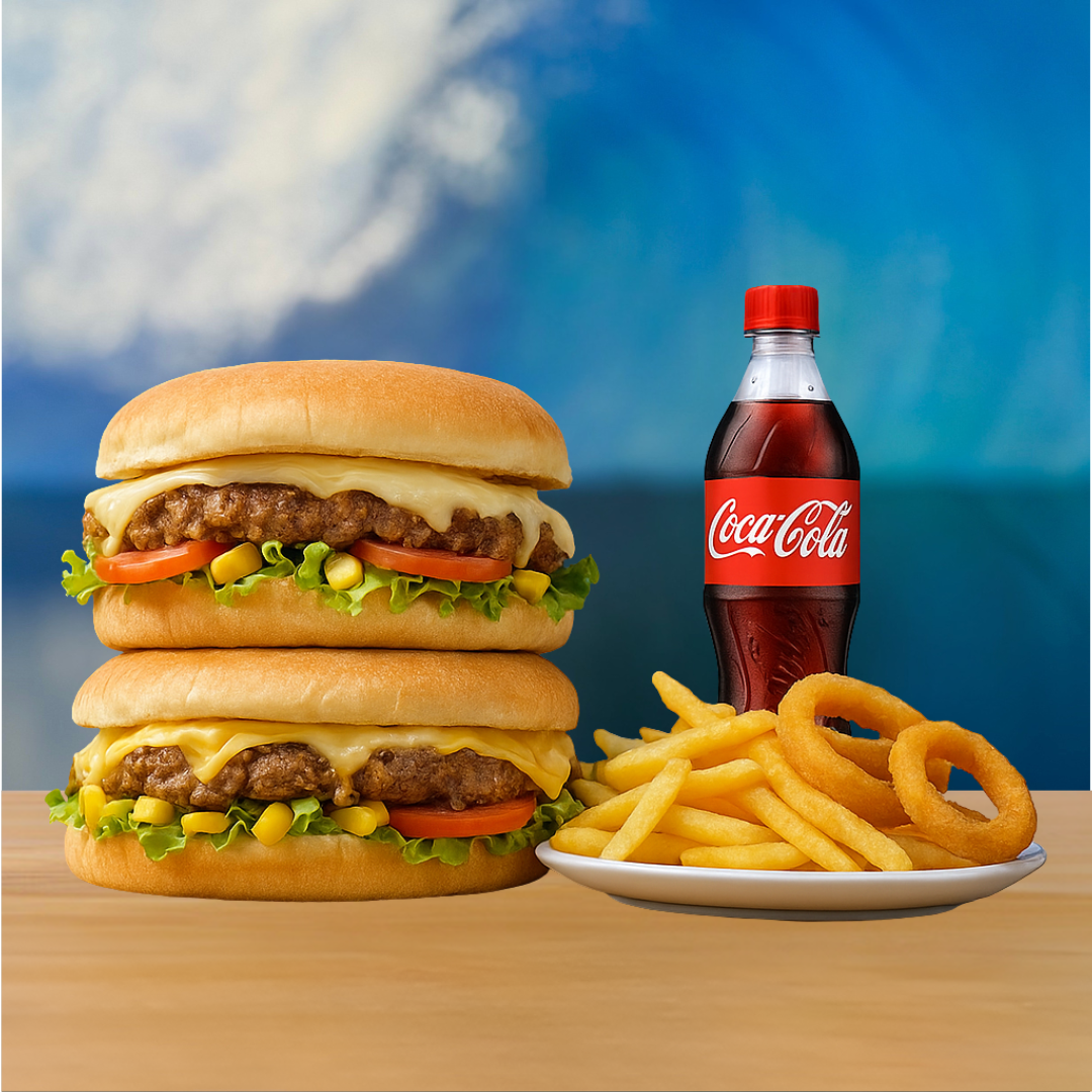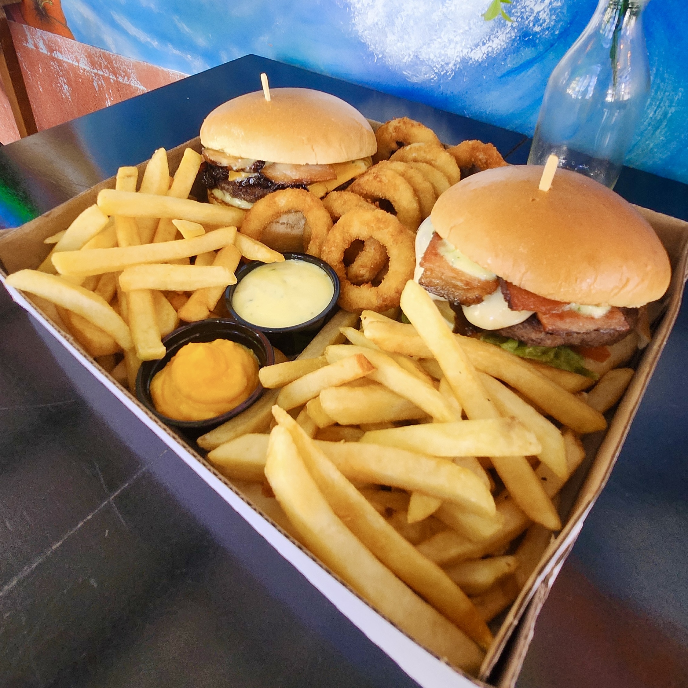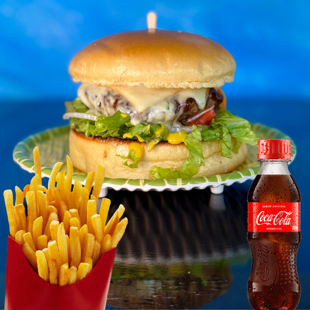 Hamburguer Maré Alta (Pão, 2 hamburguer de costela 150gr cada, molho barbecue, duplo queijo cheddar, alface, tomate, mostarda e maionese da casa.), bebida 200ml, fritas pequena ou 8 áneis de cebola.