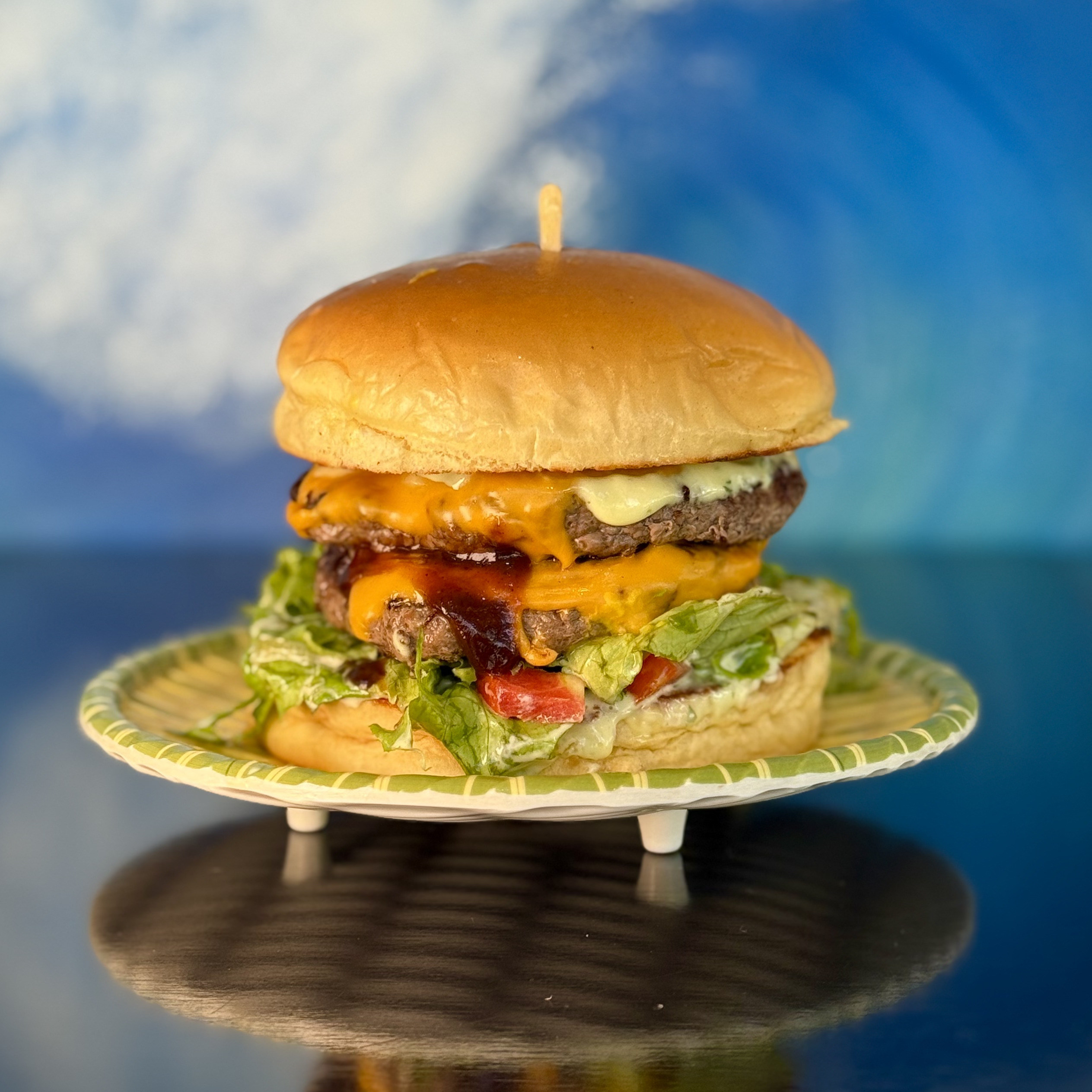 Pão, 2 hamburguer de costela 150gr cada, molho barbecue, duplo queijo cheddar, alface, tomate, mostarda e maionese da casa.