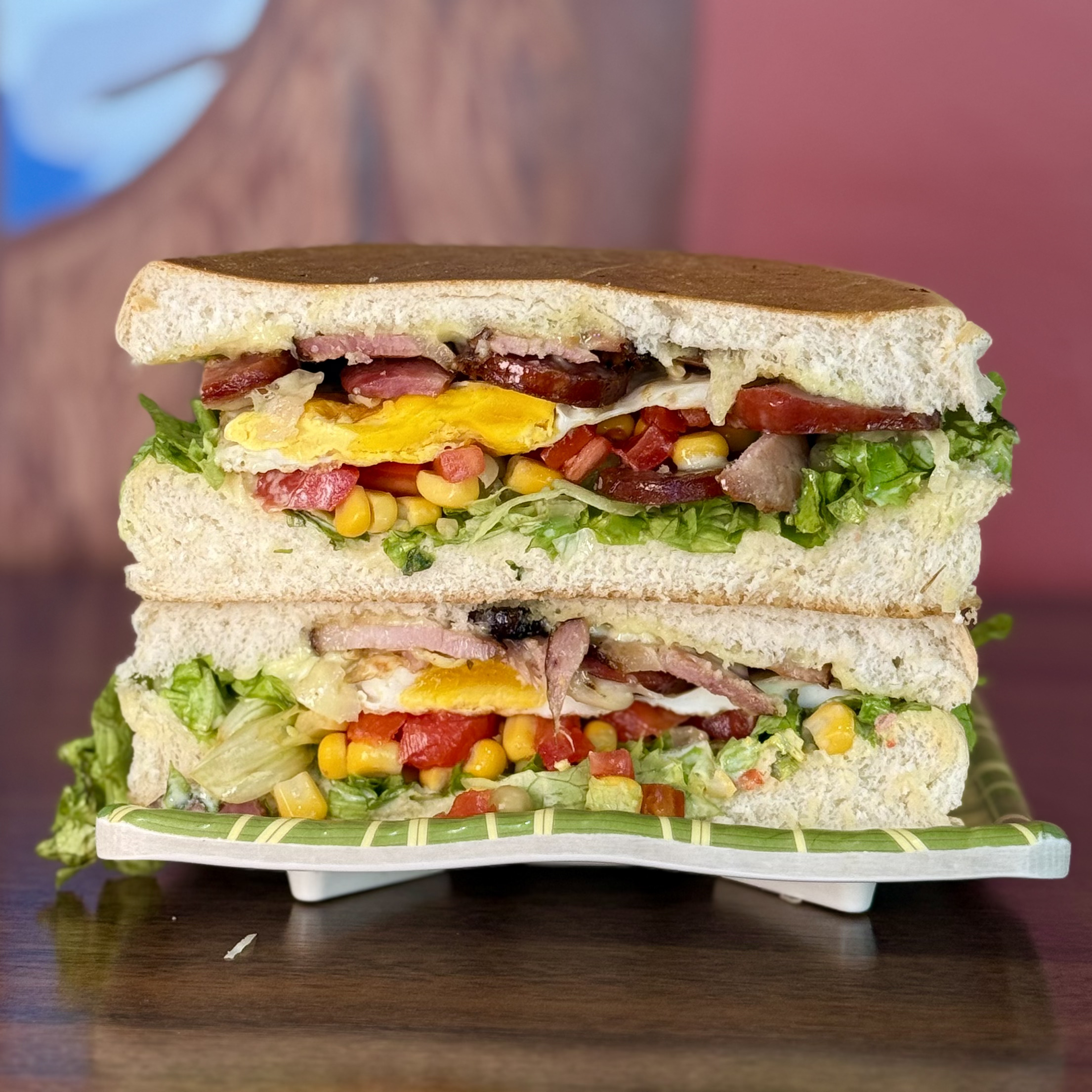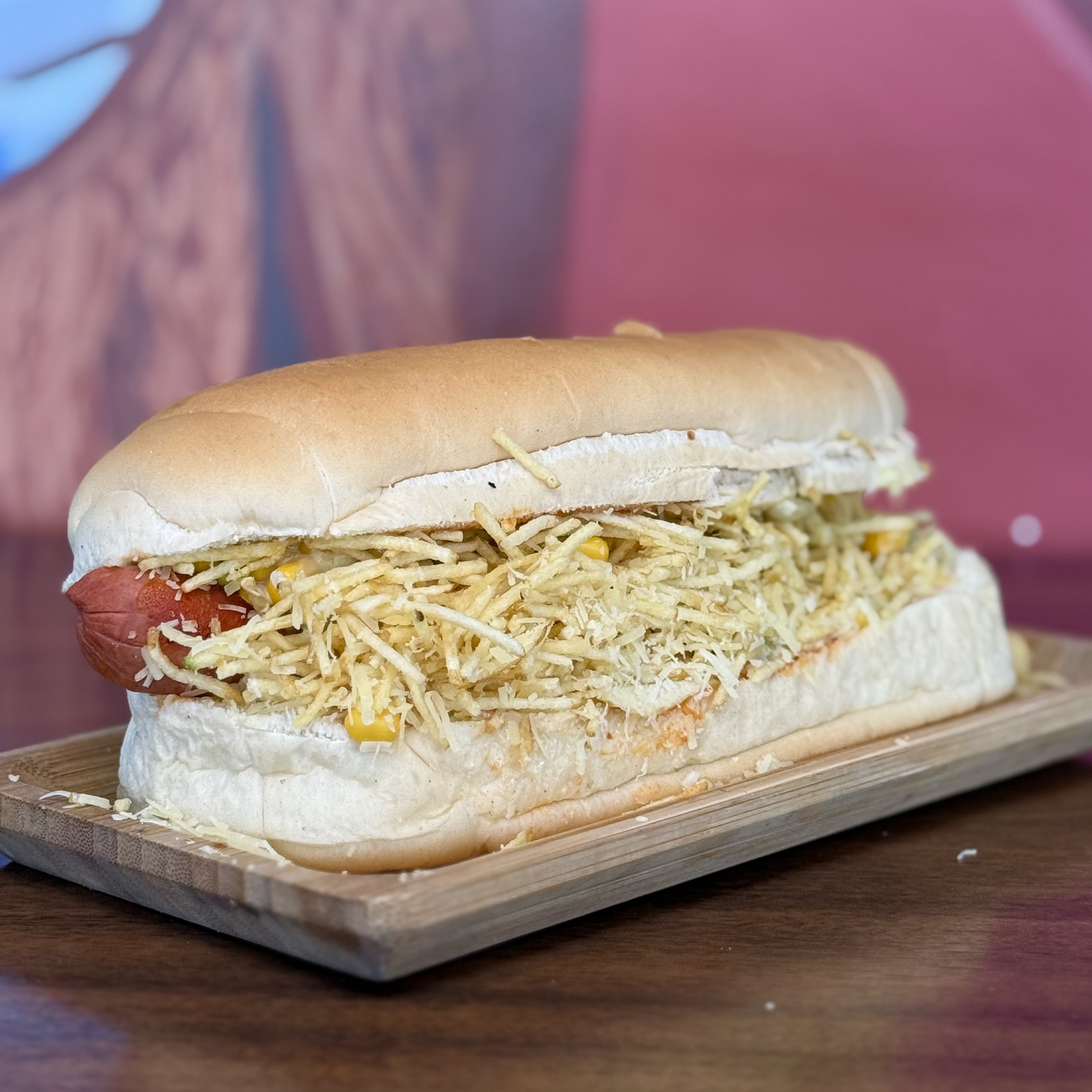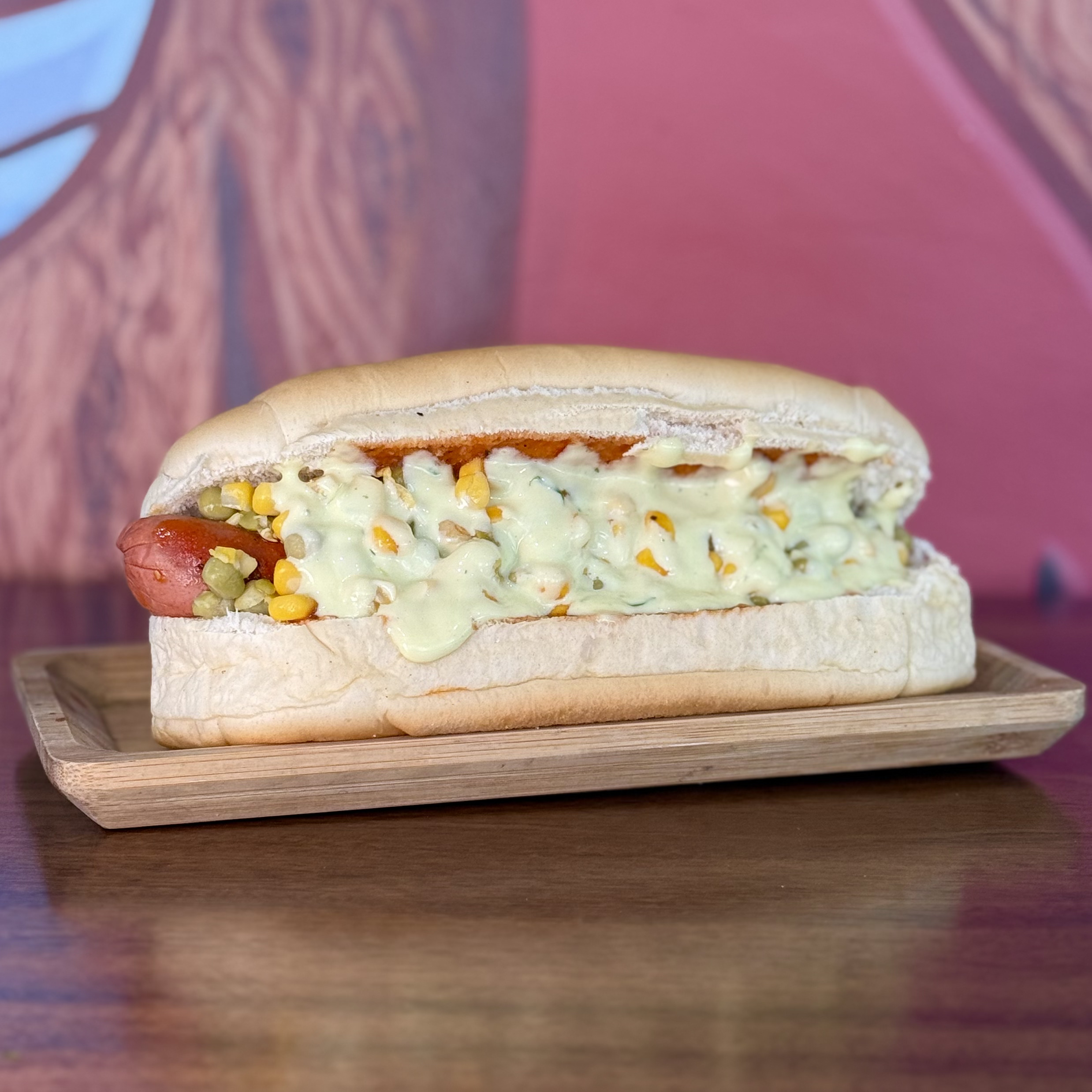 Pão, frango desfiado, bacon fatiado, queijo mussarela, ovo, alface, tomate, ervilha, milho, catchup, mostarda e maionese da casa.