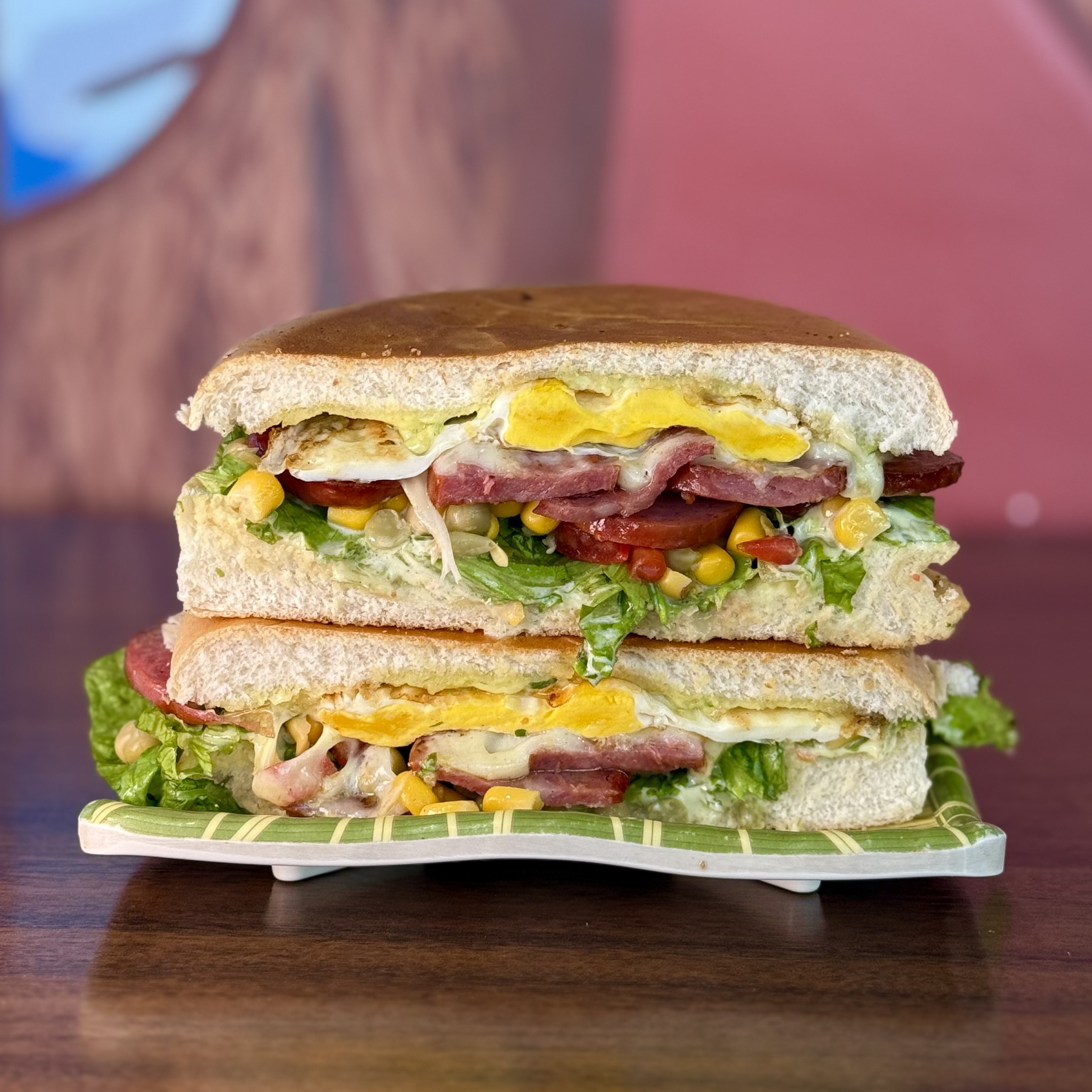 Pão, calabresa fatiada, bacon, queijo mussarela, ovo, alface, tomate, ervilha, milho, catchup, mostarda e maionese da casa.