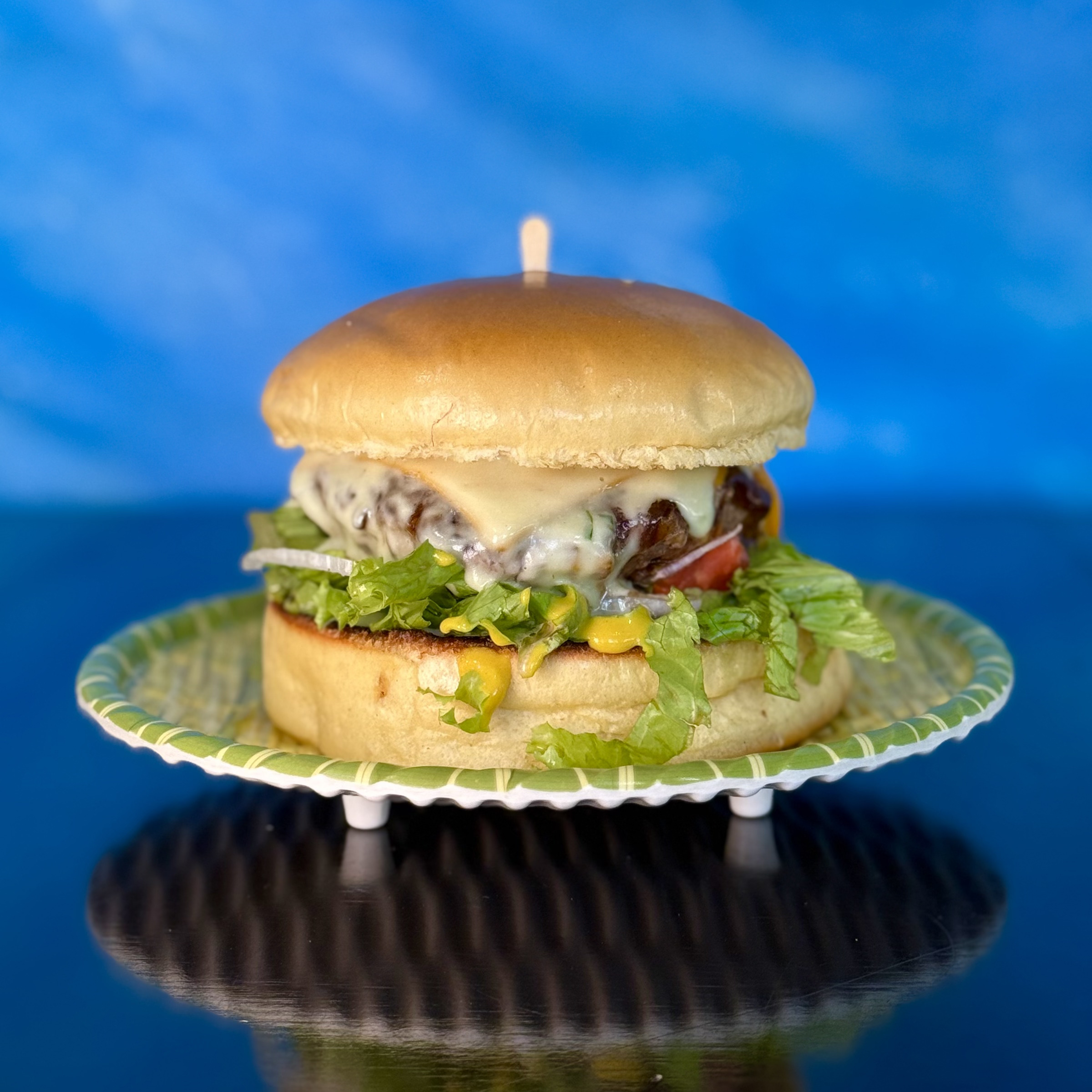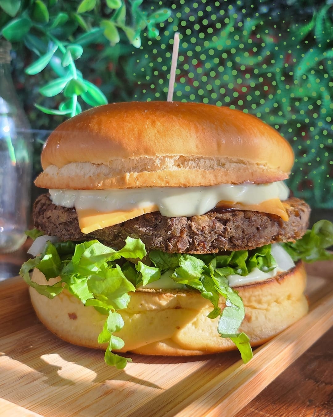 Pão, hamburguer de lentilha 140gr, duplo queijo cheddar, alface, tomate, cebola, mostarda e maionese da casa.