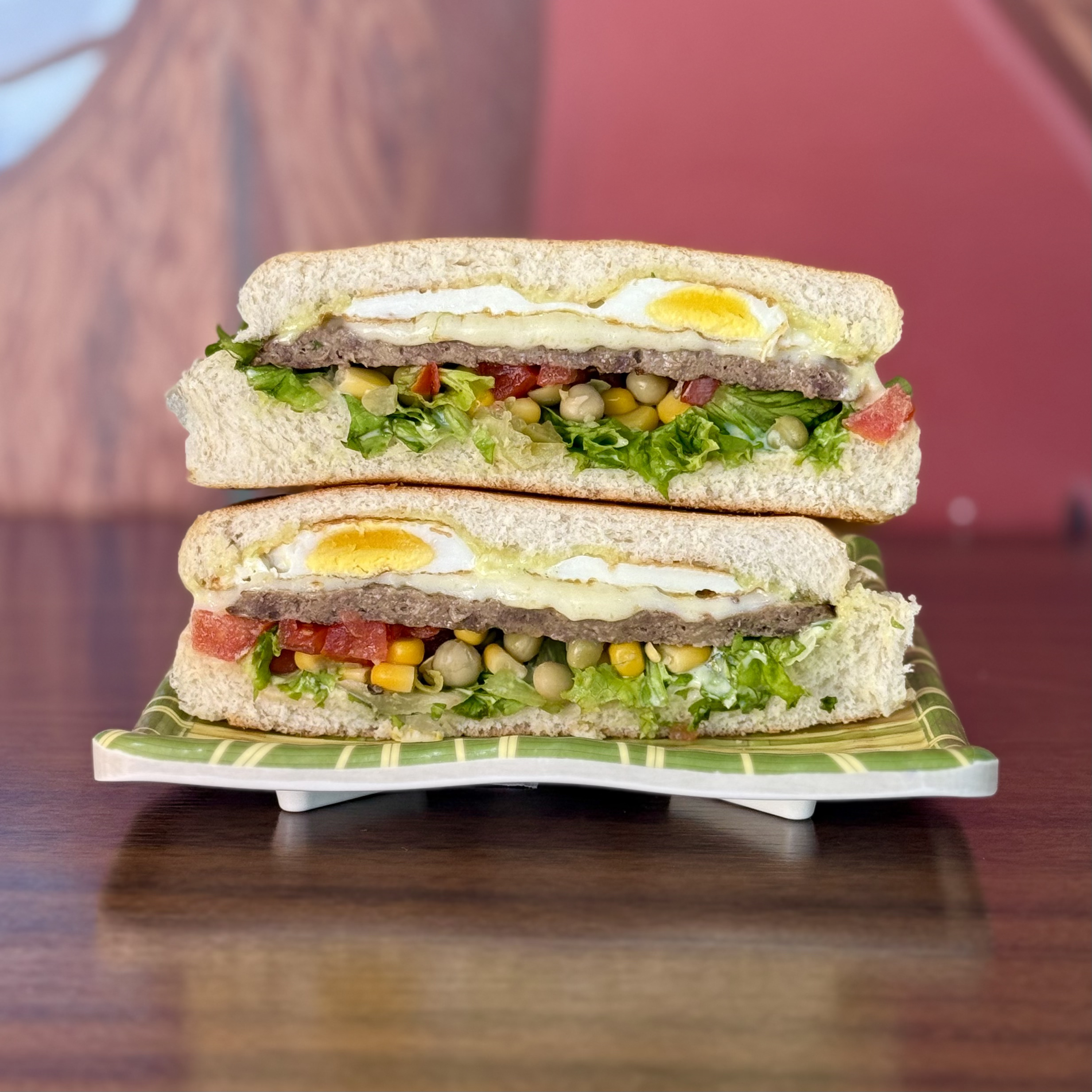 Pão, hamburguer de lentilha 130g, queijo mussarela, ovo, alface, tomate, ervilha, milho, catchup, mostarda e maionese da casa.