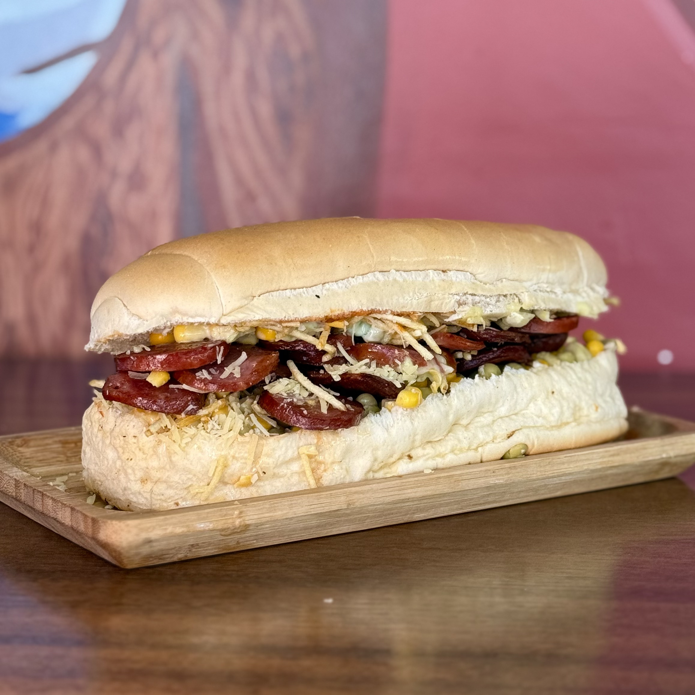 Pão, calabresa fatiada, queijo mussarela, ovo, alface, tomate, ervilha, milho, catchup, mostarda e maionese da casa.