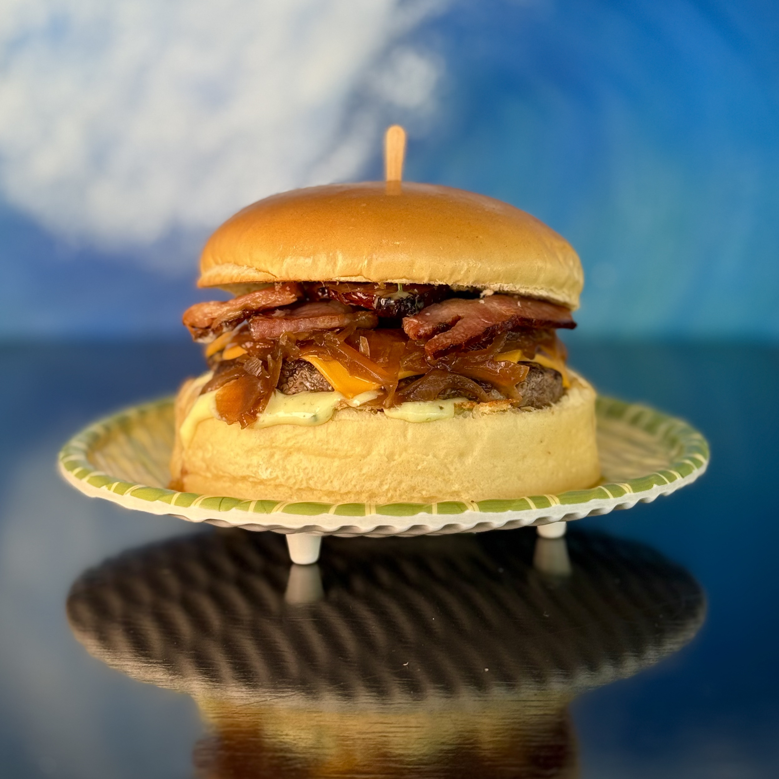 Pão, hamburguer de costela 150g, saborosas fatias de bacon, duplo queijo cheddar, cebola caramelizada picante, e a deliciosa maionese Maresia.
