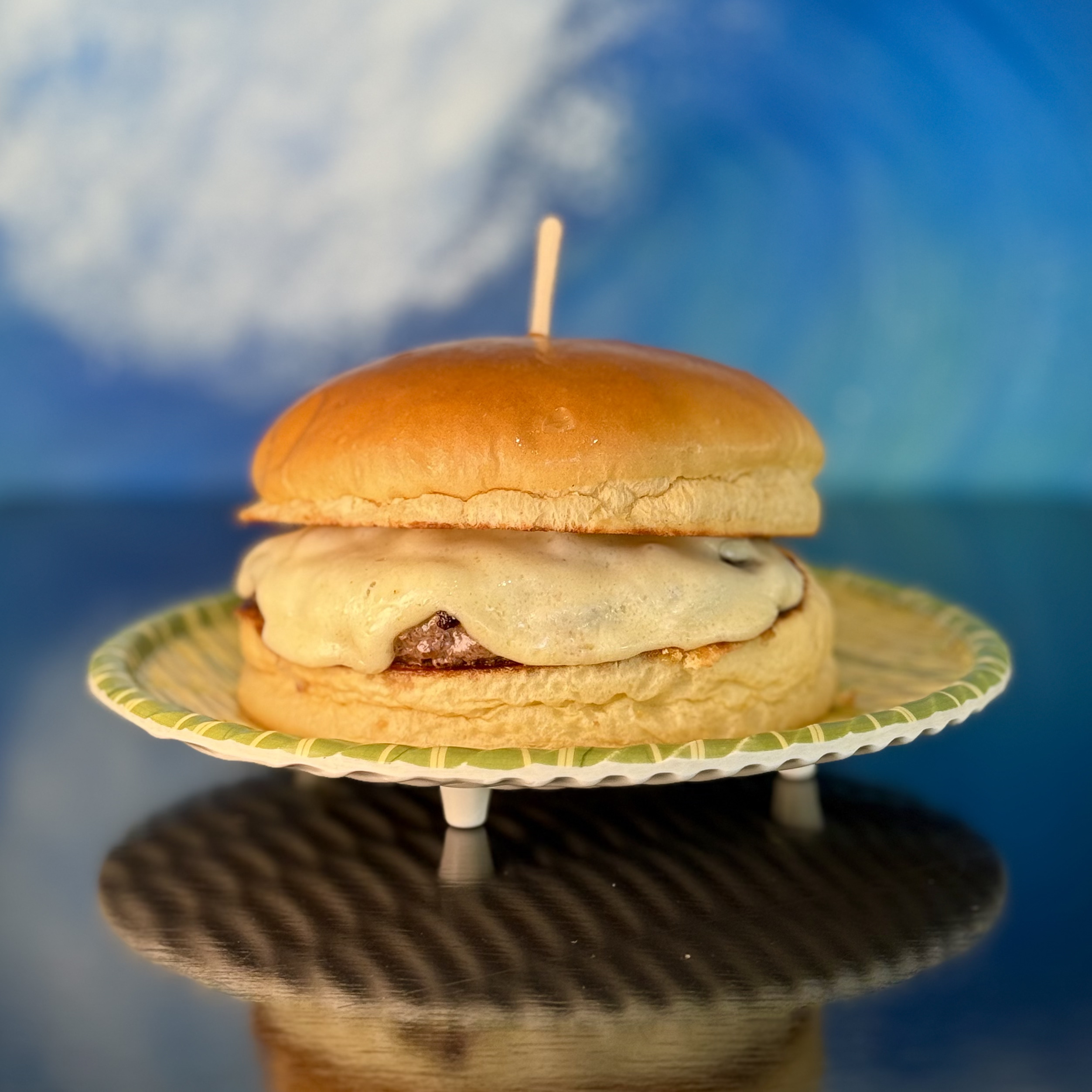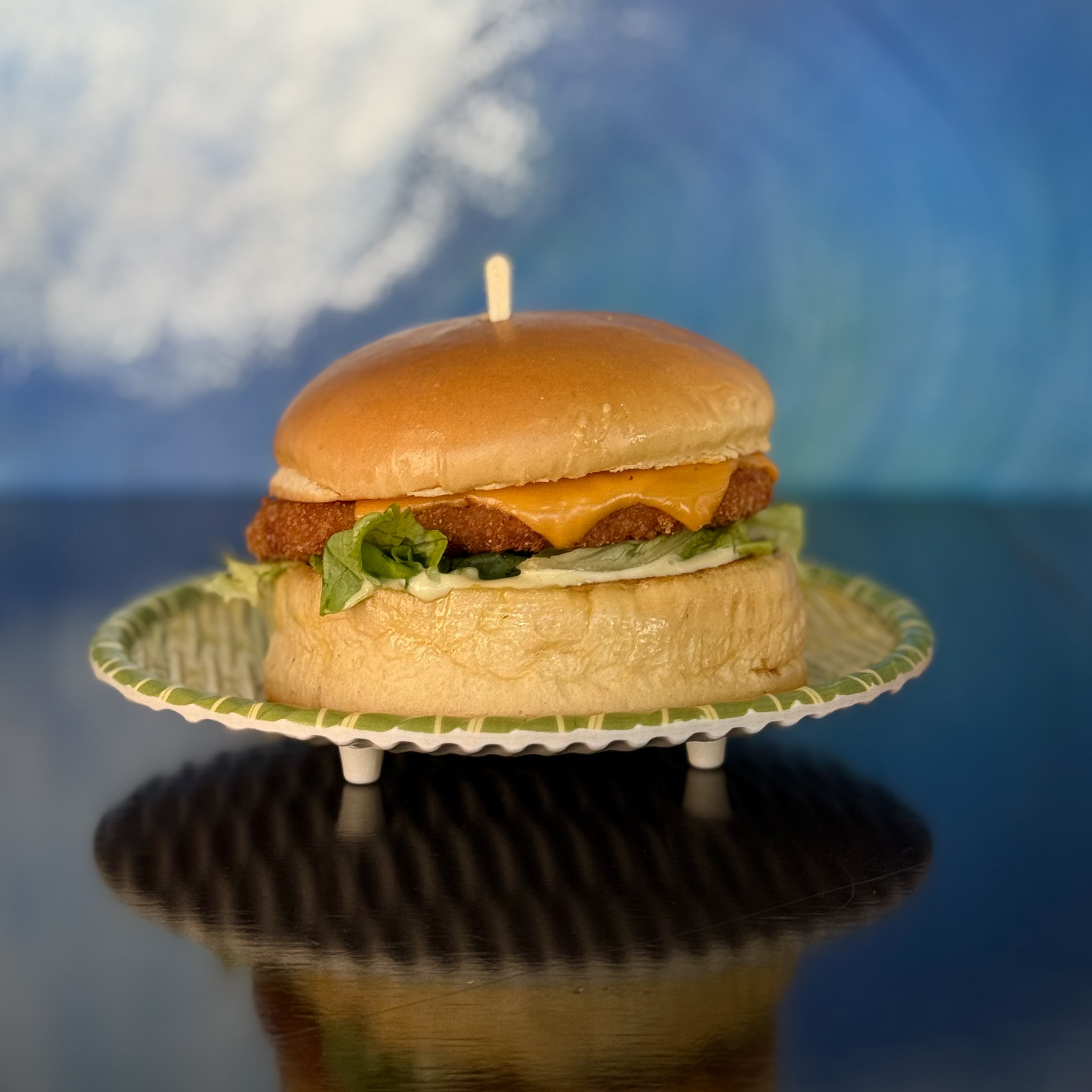 Hamburguer de frango empanado, duplo queijo cheddar, alface, cebola e maionese maresia.