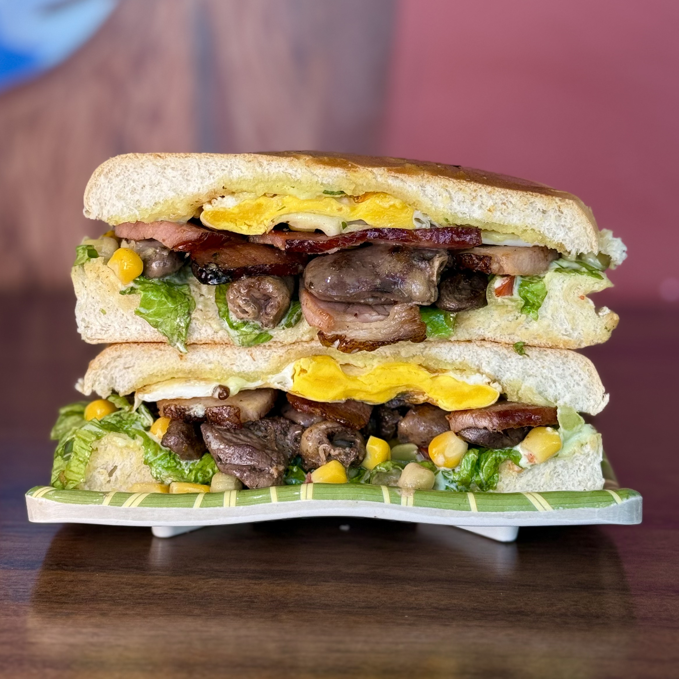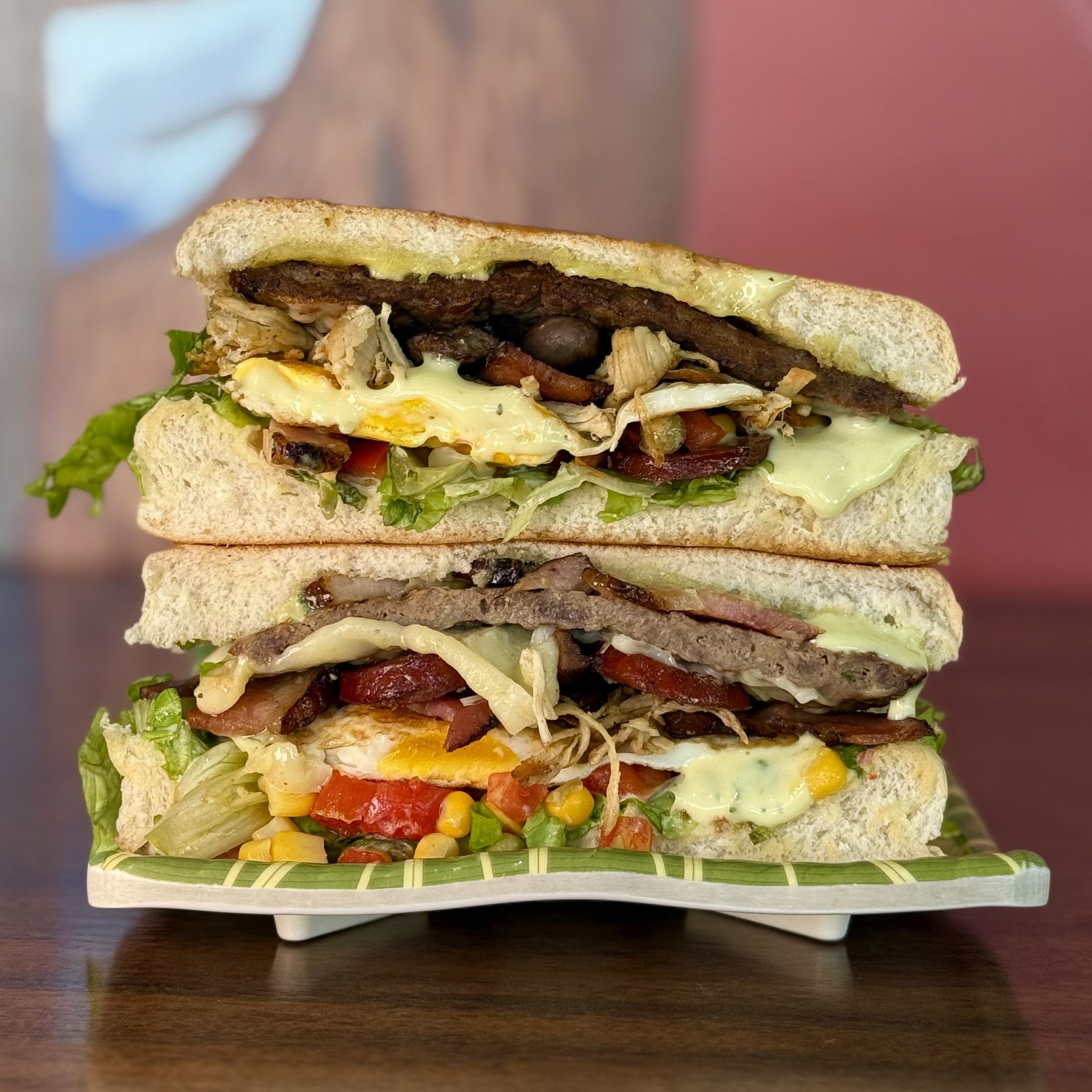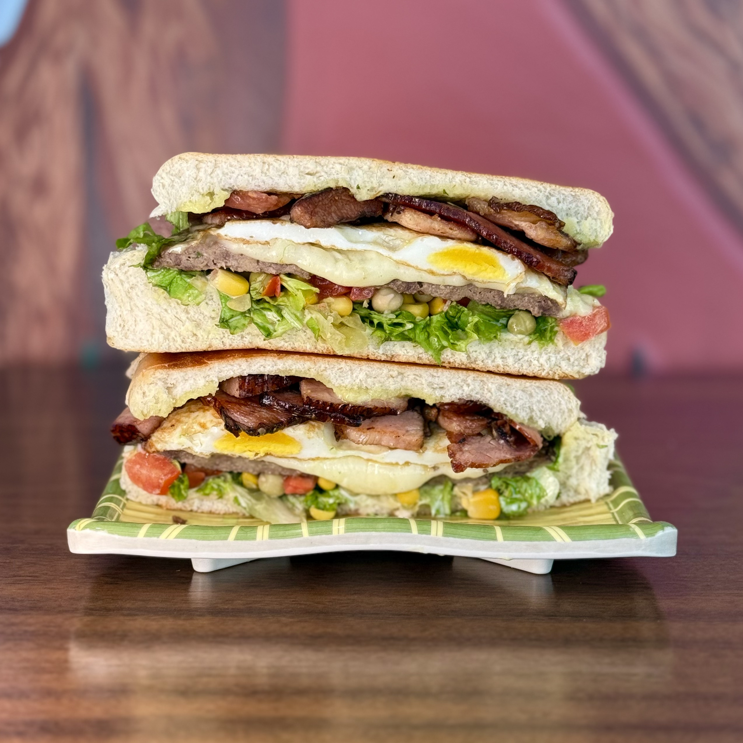 Pão, hamburguer de carne 130g, bacon, coração, calabresa,frango desfiado, queijo mussarela, ovo, alface, tomate, ervilha, milho, catchup, mostarda e maionese da casa.