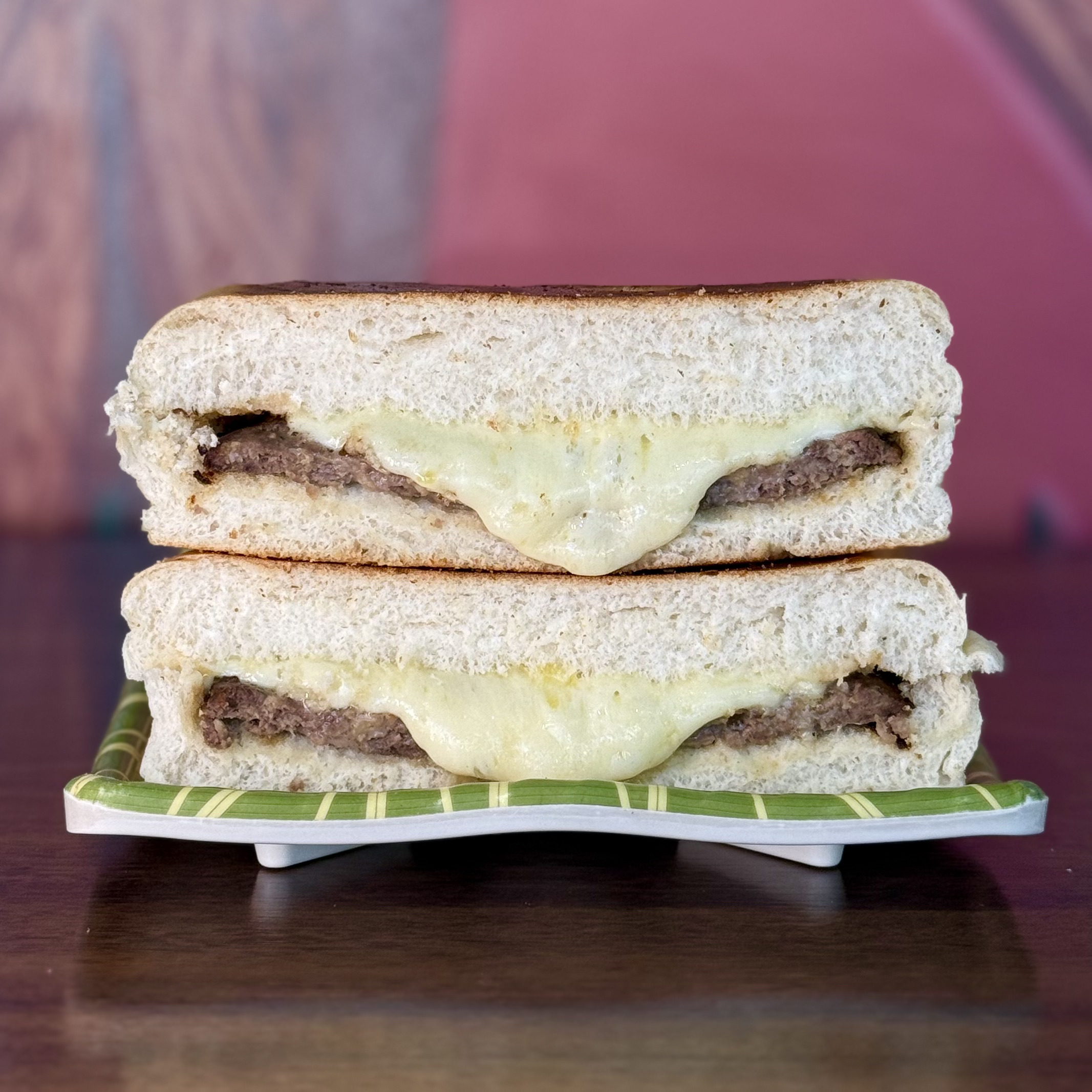 Pão, hamburguer de carne 130g, 2 fatias de queijo mussarela.