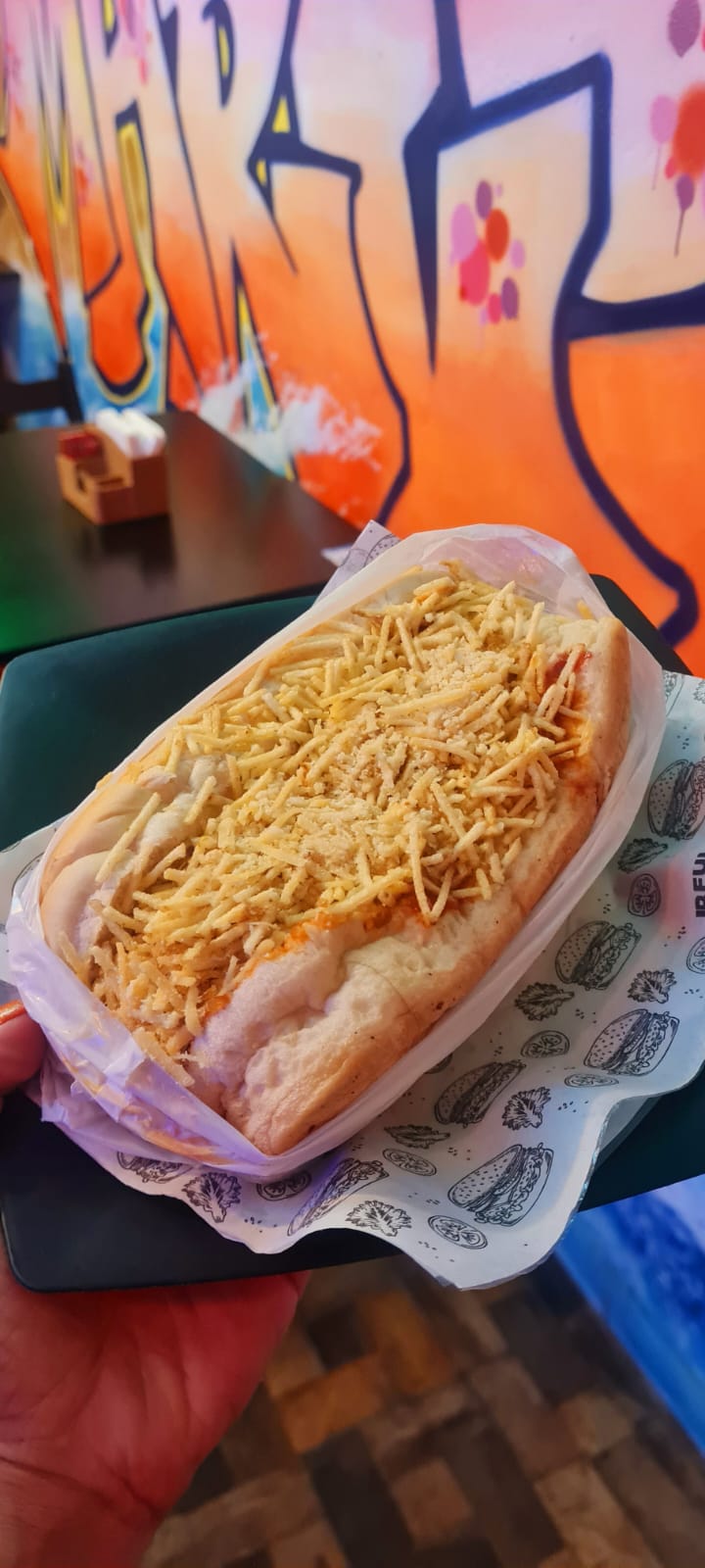 Pão, ovo frito, molho, milho, ervilha, catchup, mostarda, batata palha, queijo ralado e maionese caseira.