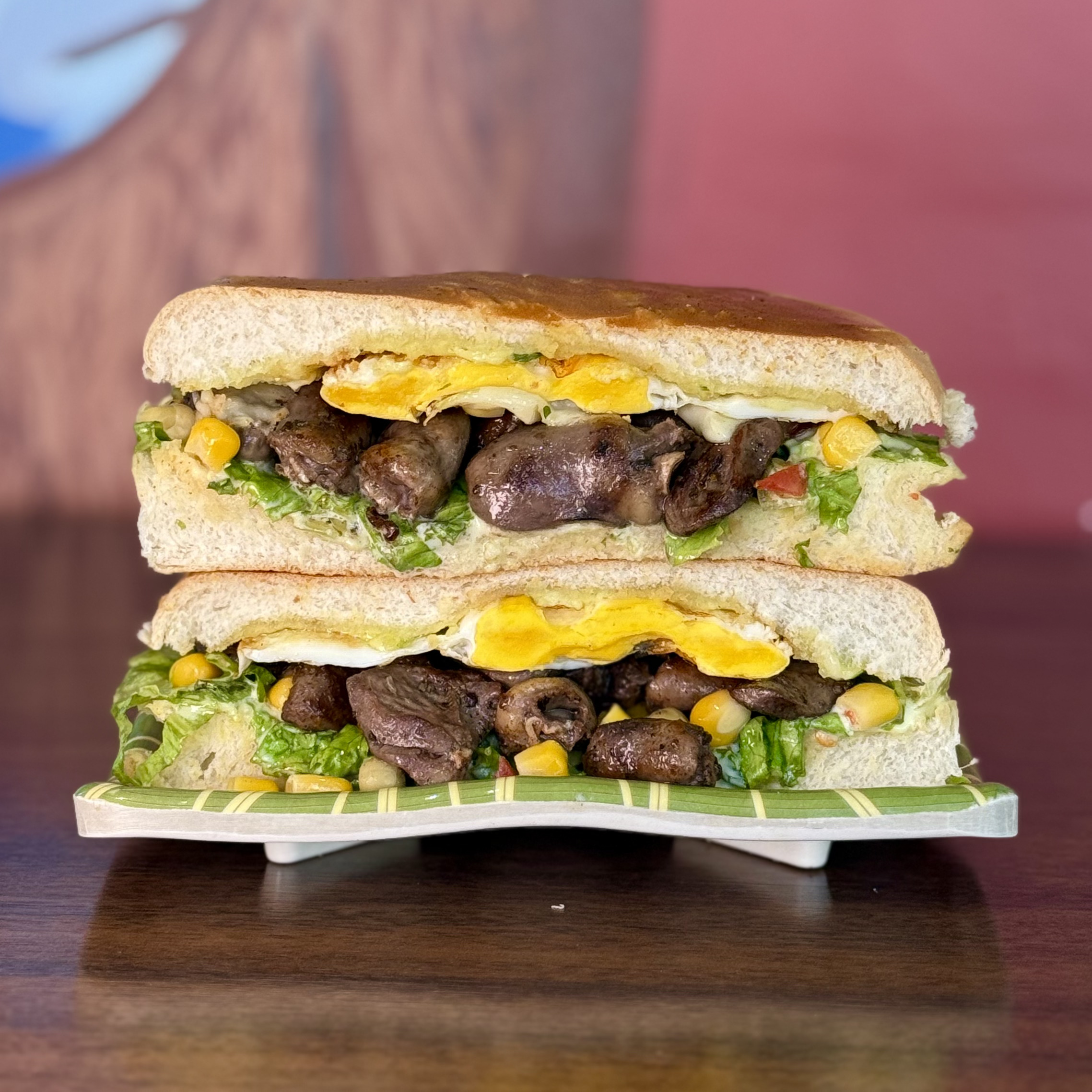 Pão, coraçãozinho ao meio, queijo mussarela, ovo, alface, tomate, ervilha, milho, catchup, mostarda e maionese da casa.