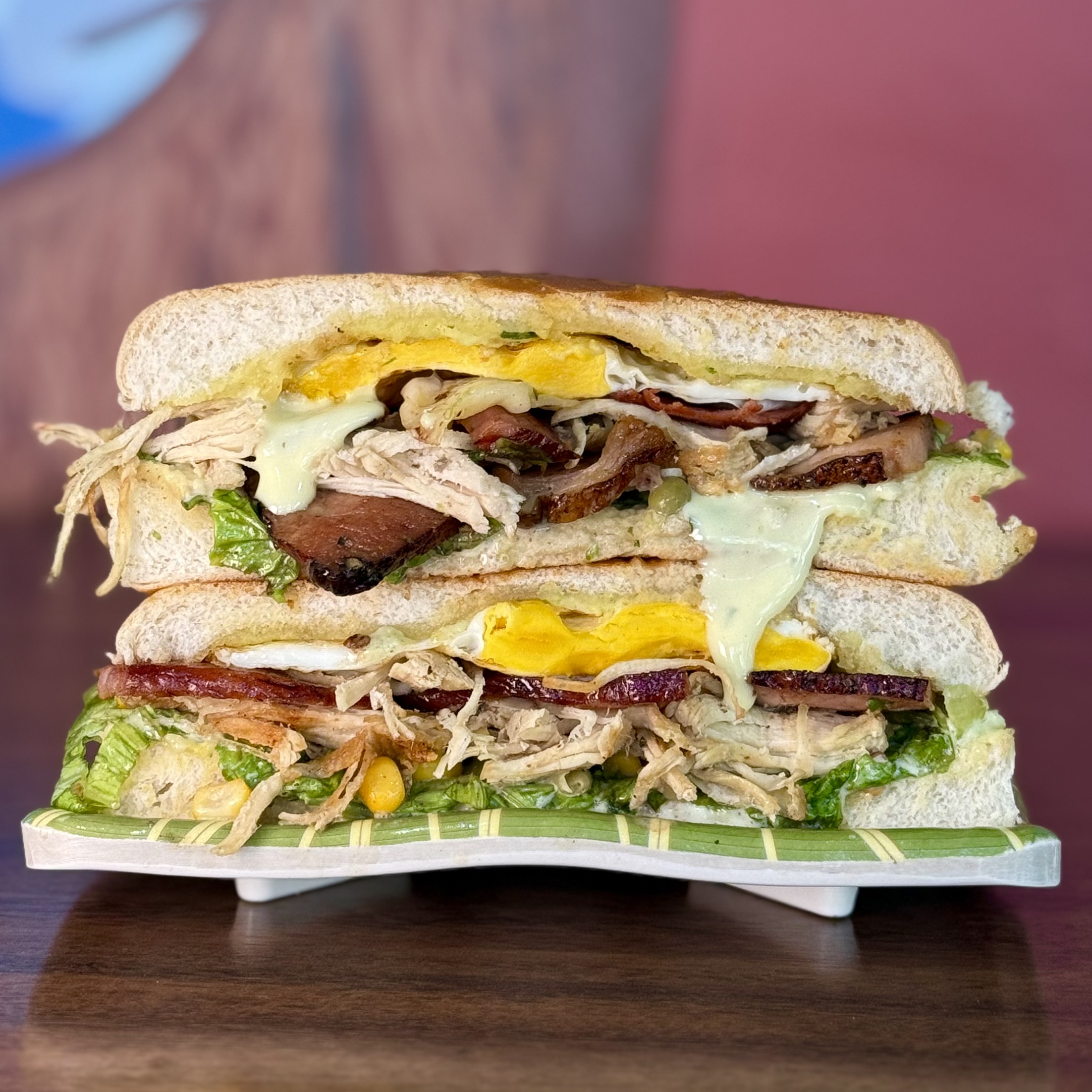 Pão, frango desfiado, creme catupiry, queijo mussarela, ovo, alface, tomate, ervilha, milho, catchup, mostarda e maionese da casa.