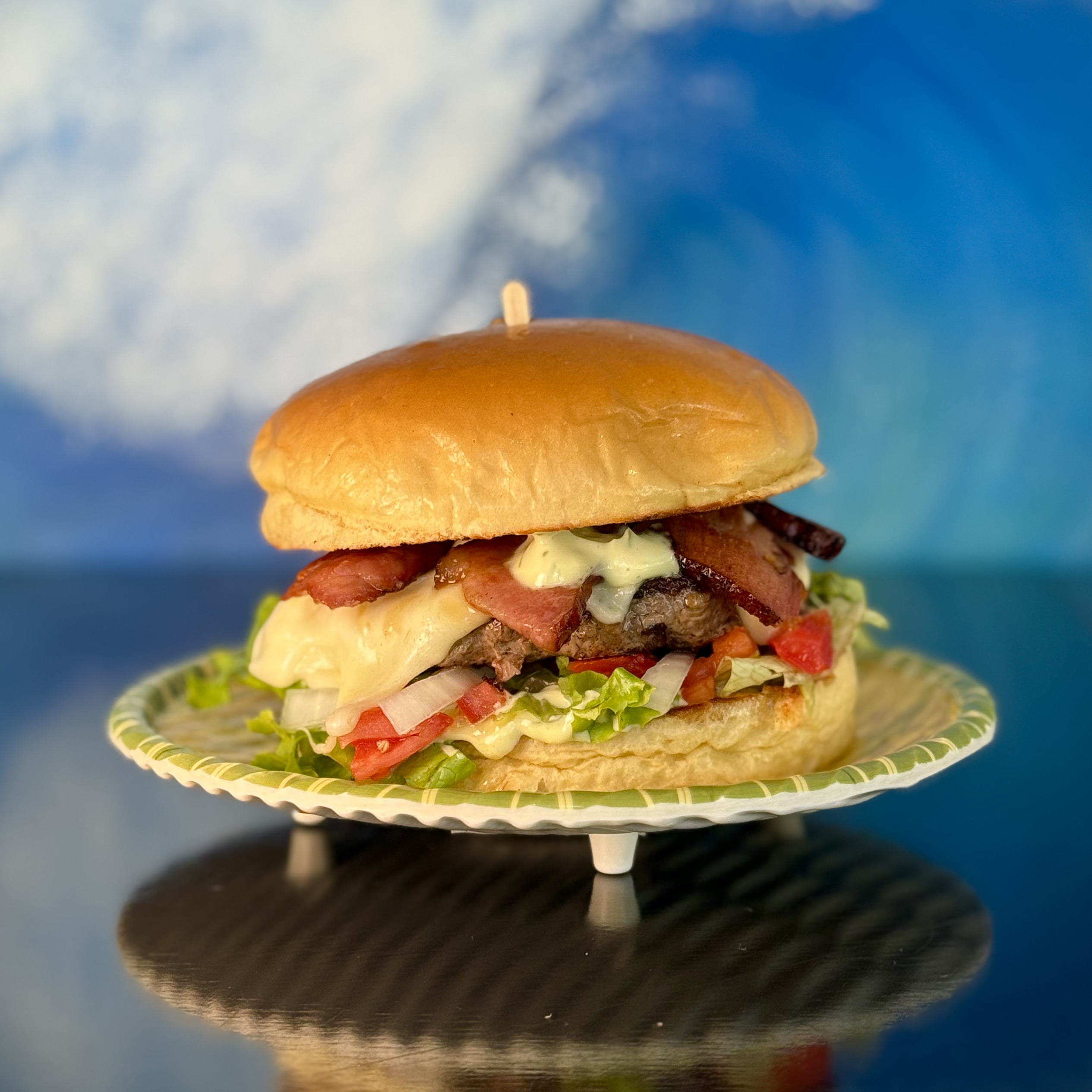 Pão, hamburguer de costela 150gr, bacon, molho barbecue, duplo queijo mussarela, alface, tomate, cebola, e maionese da casa.