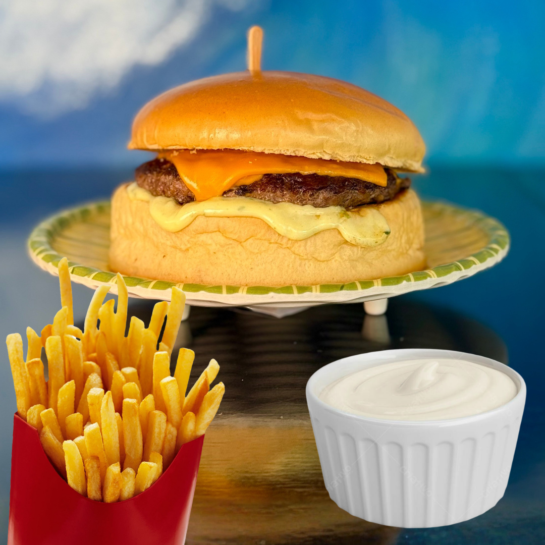 Hamburguer Da Hora (Pão, hamburguer de costela150g, maionese maresia e queijo cheddar.) + fritas e maionese no potinho